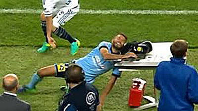 Also early in the second half there was a sickening collision when Sydney FC defender Michael Zullo smashed head first into an ill placed officials table on the sideline.