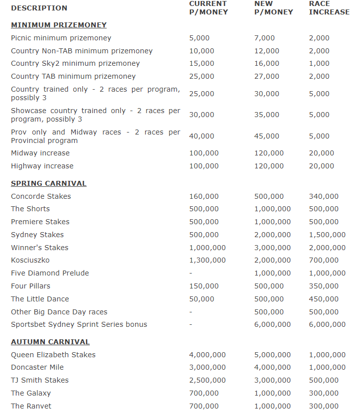 There have also been increases in prizemoney for key races during the Sydney Autumn Carnival: