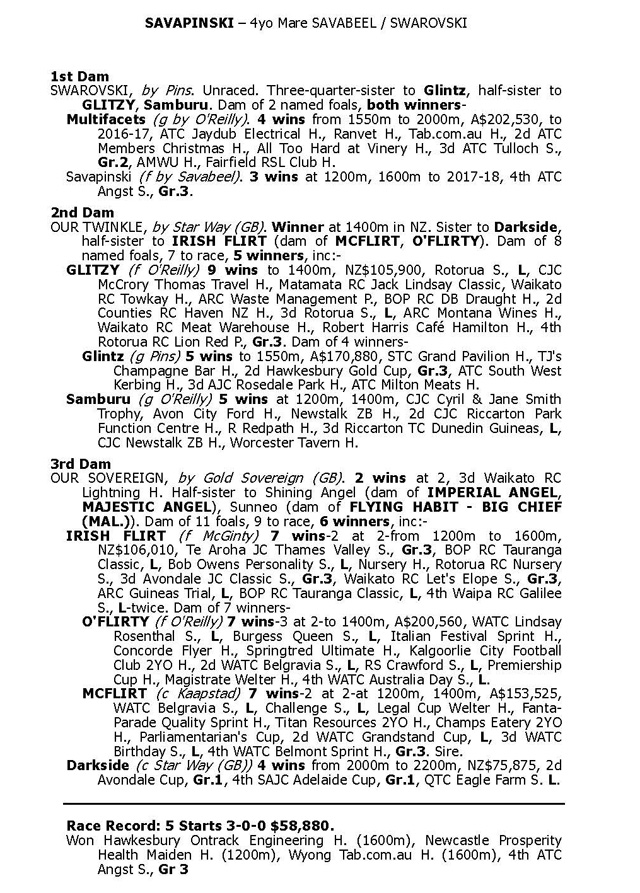 Savapinski is a half-sister to Multifacets a Gr2 placed winner of 4 races and 5 placings from 1500m – 2000m and $202,000 in earnings.