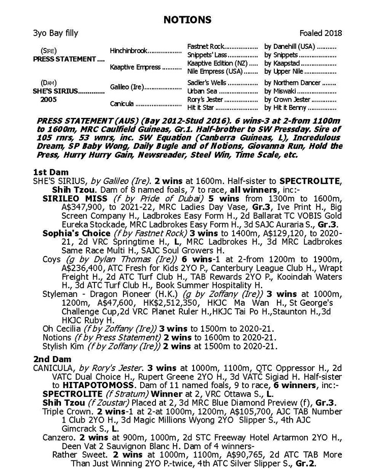 highly promising 3yo filly NOTIONS (Press Statement x She's Sirius) who is the