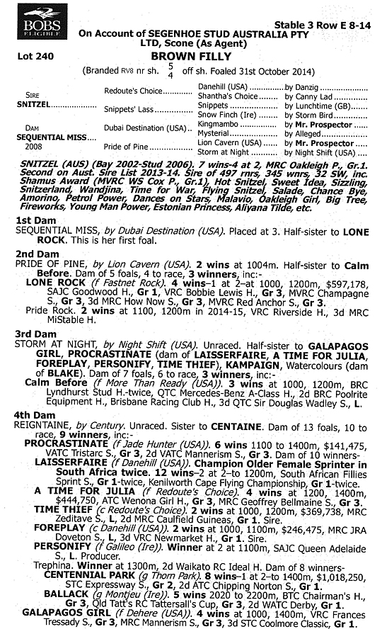 DYNAMIC SYNDICATIONS purchased a fabulous filly by SNITZEL ex SEQUENTIAL MISS at the Inglis Classic sale from the draft of leading thoroughbred nursery SEGENHOE STUD.