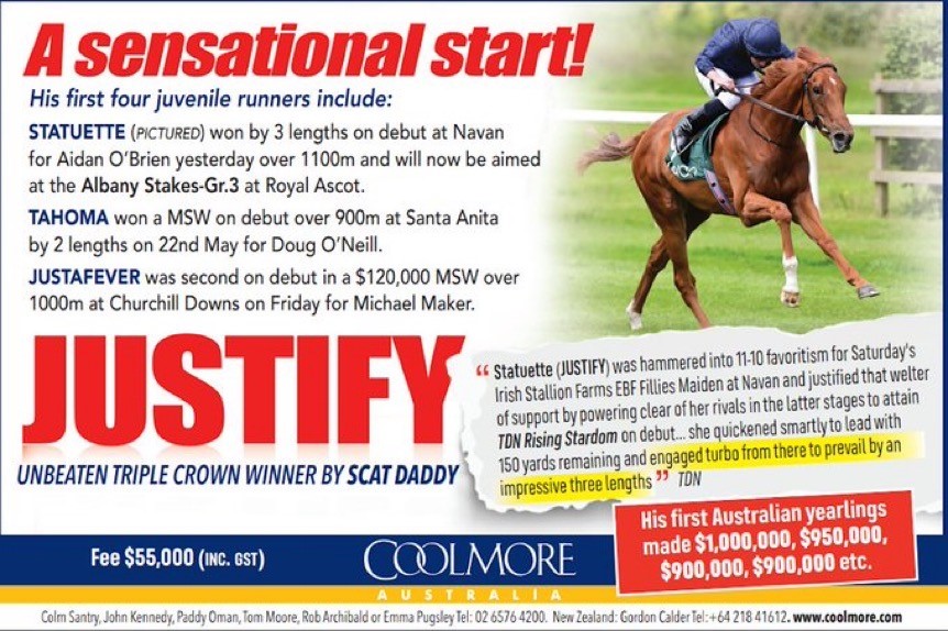 Justify will have his first Australian runners next season with his progeny selling here for up to $1million at the sales this year.