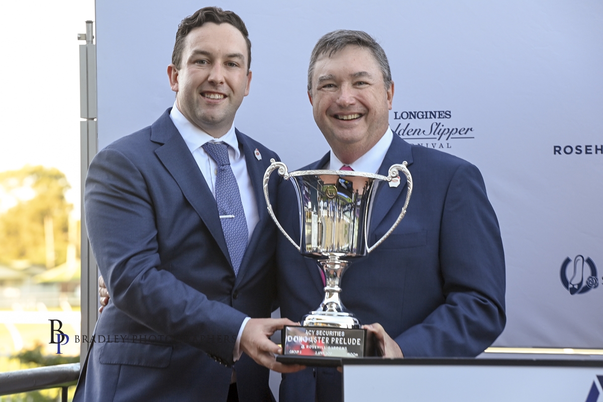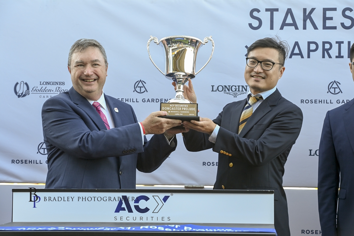 Dean Watt accepts the trophy from the sponsor ACY Securities for the Doncaster Prelude win