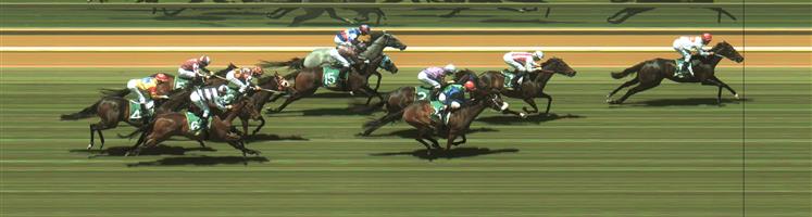 SENSATIONALISATION to get in a rhythm and then, once Forche settled on speed, he allowed our filly to move up a length and sit at the girth of the leader, with the eventual runner-up Best Episode on our tail, and the eventual third horse on the back of the runner-up, as the field spread out over 10 lengths by the time they had passed the 800m.
