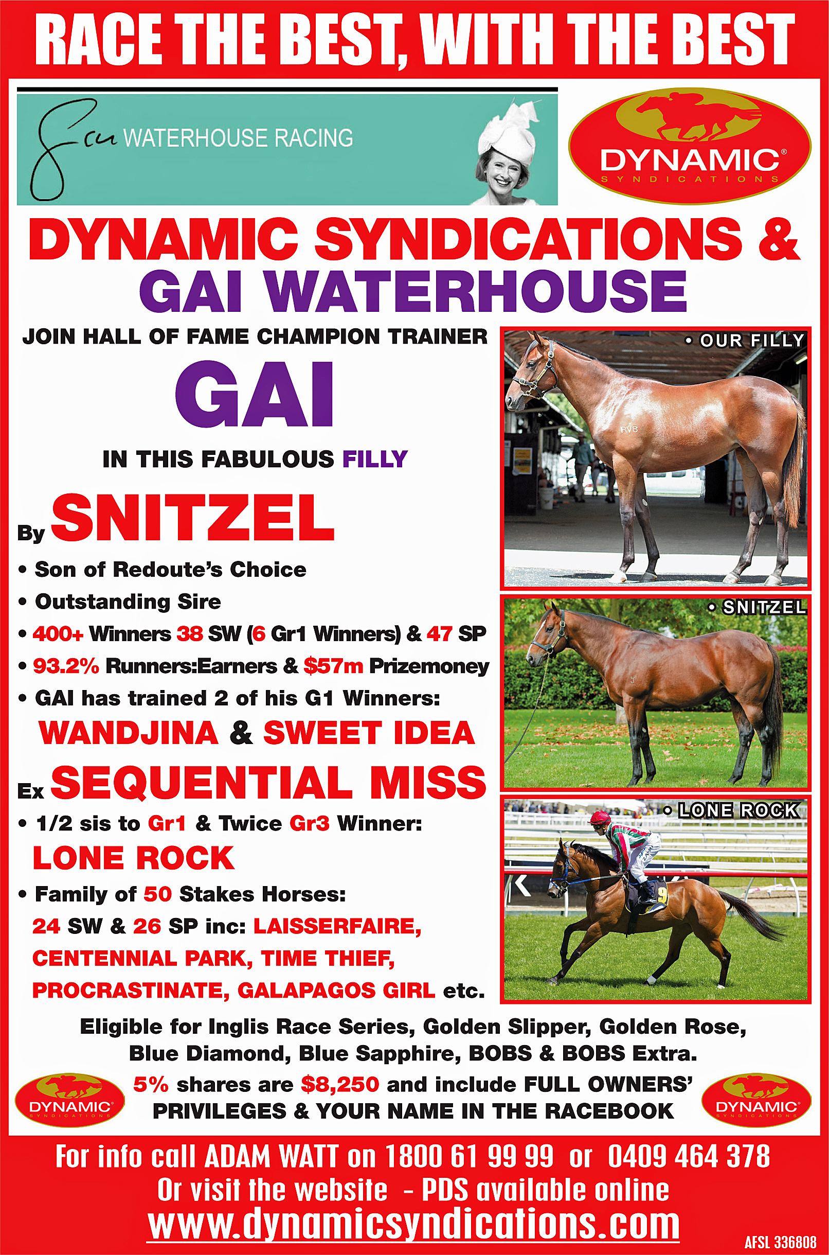 Contact Adam Watt at Dynamic Syndications on 02 9587 1511 and have a chat about how you can be an owner in this wonderful filly by Australia’s gun sire.
