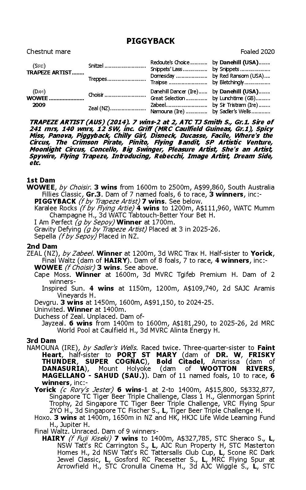 PIGGYBACK is the second-best of the progeny of her sire and the Best Filly by TRAPEZE ARTIST to date, being a dual Gr3 winner with only GRIFF ranked above her after its Gr1 win of the Caulfield Guineas appearing on his resume. GRIFF is retired and has begun a career at stud.