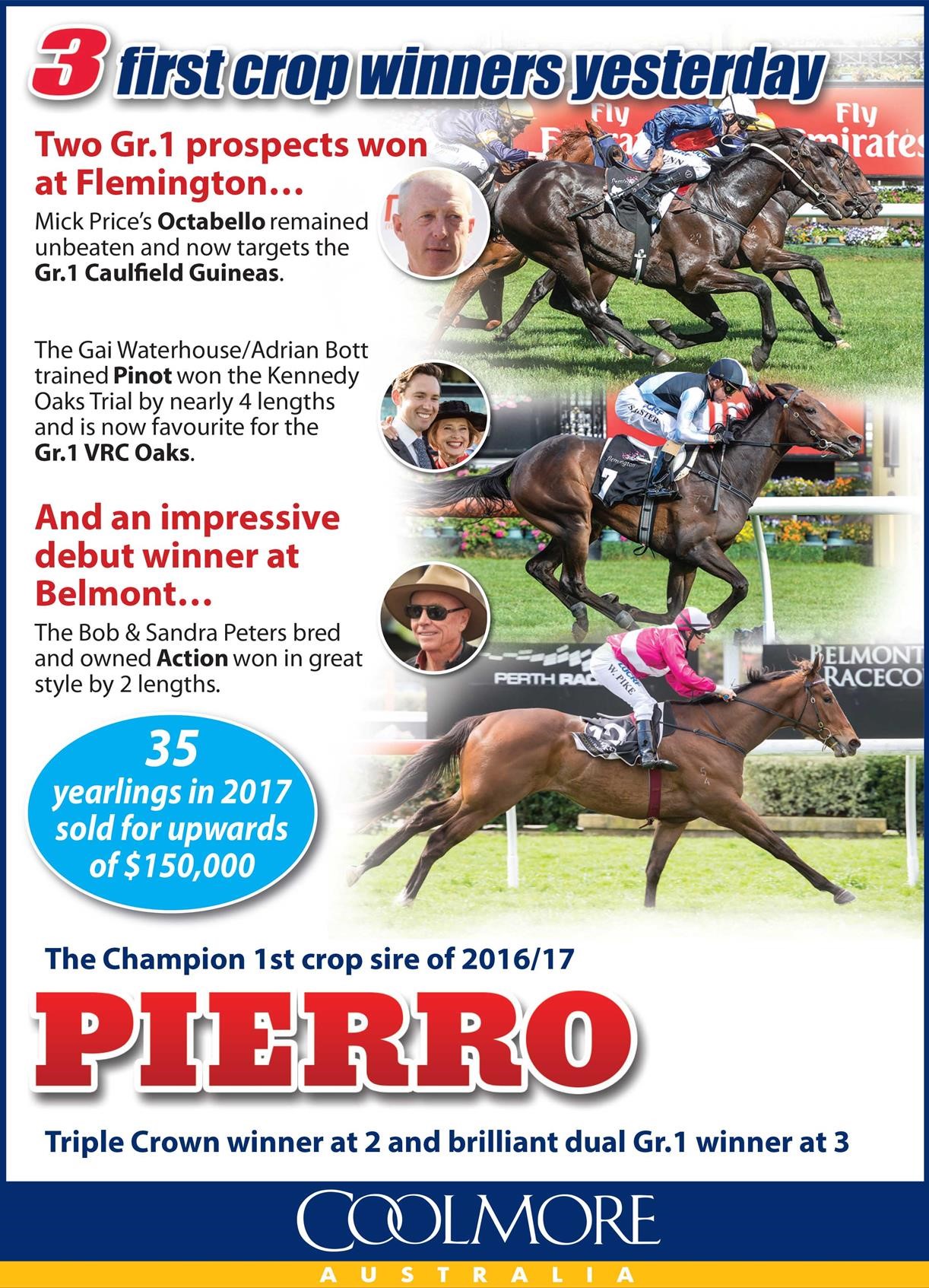 Reigning champion first season sire PIERRO served notice to his Second Season Sire peers on Wednesday with three (3) Metropolitan winners highlighted by a resounding win in the $50,000 VRC Kennedy Oaks Trial for
