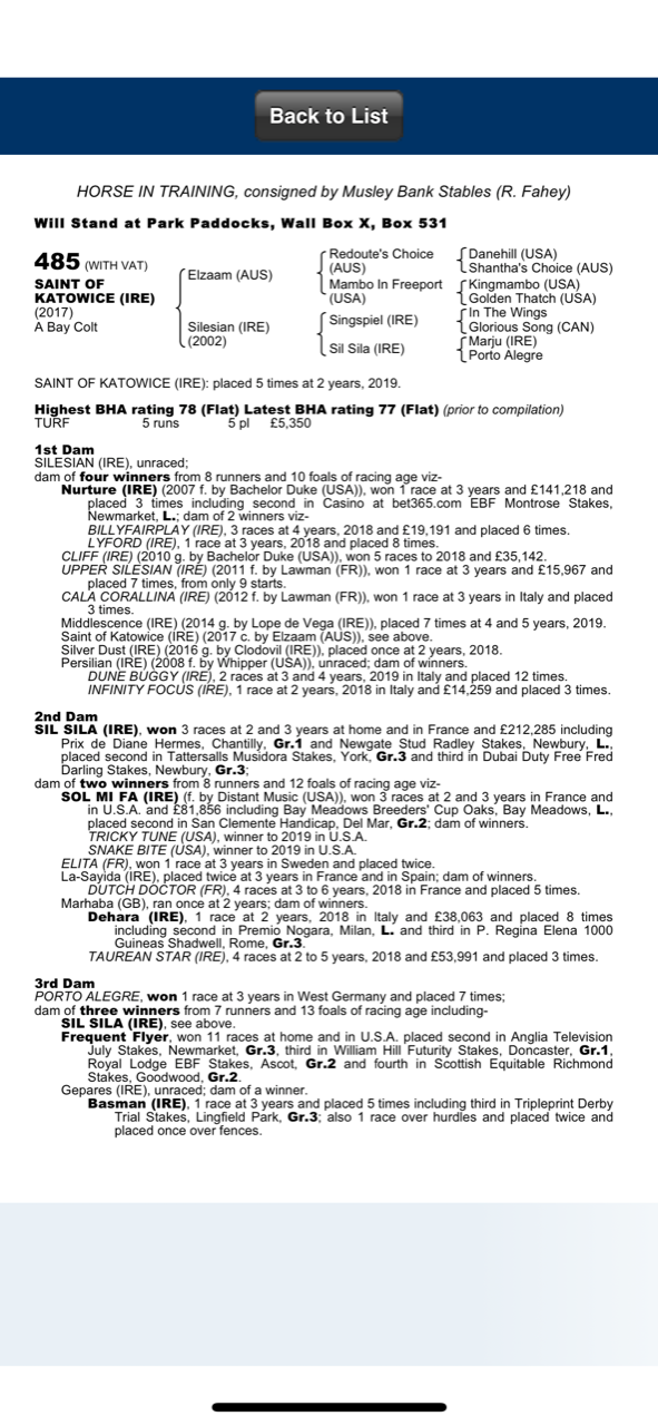 SAINT OF KATOWICE is a 2YO COLT by Elzaam (a son of Redoute’s Choice)