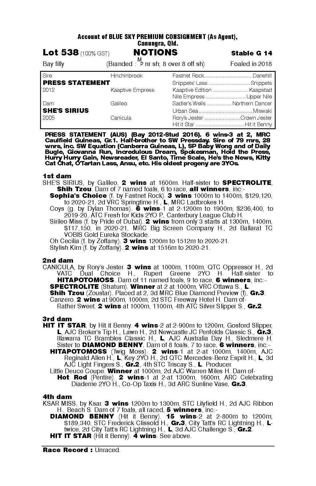LOT 538 NOTIONS (2yo f Press Statement x She’s Sirius by Galileo).