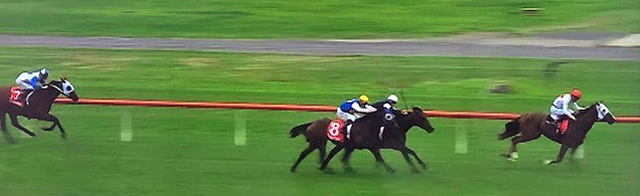 TEXCEL in front and full of running, with Grid peeling out to be in the running line, whilst State Squad was further back and giving chase to Grid.