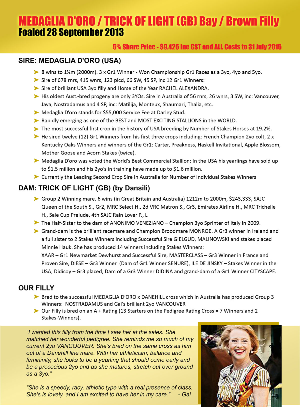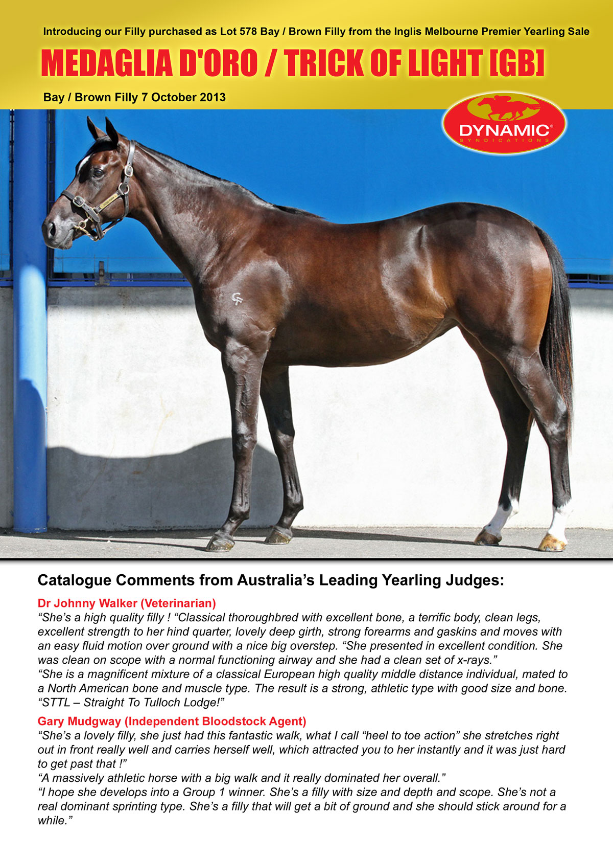 stunning filly by the MEDAGLIA D’ORO – the Champion Sire of her superb Colt, out of the Group 2 Winning mare TRICK OF LIGHT.