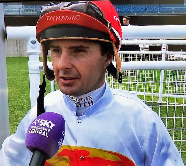 our jet pilot Christian Reith, who was patient and picked his way through the field from second last, some 8 lengths off the leaders at the 600m, to weave a magical passage and when the gap came at the 400m