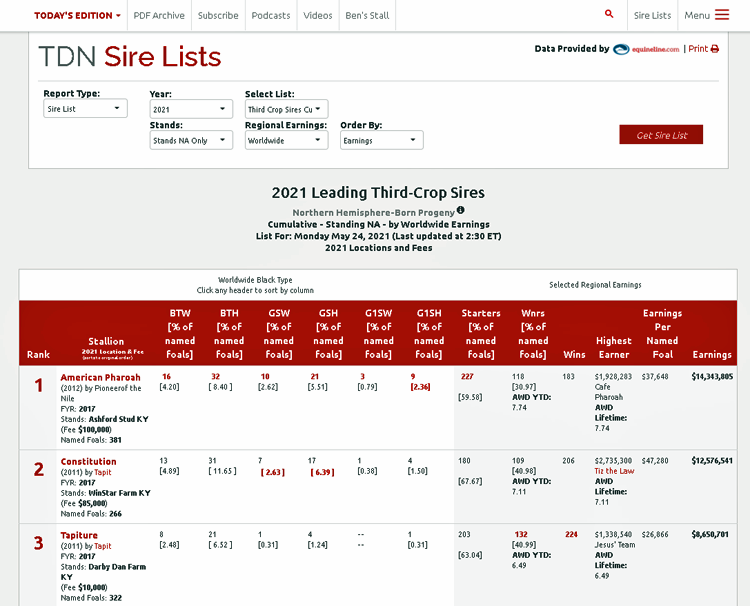 leads all North American and European third crop sires premierships by number of Group 1 winners, Group 1 performers, Group Stakes Winners, Group Stakes Horses, Stakes Winners overall, and Stakes Horses overall.