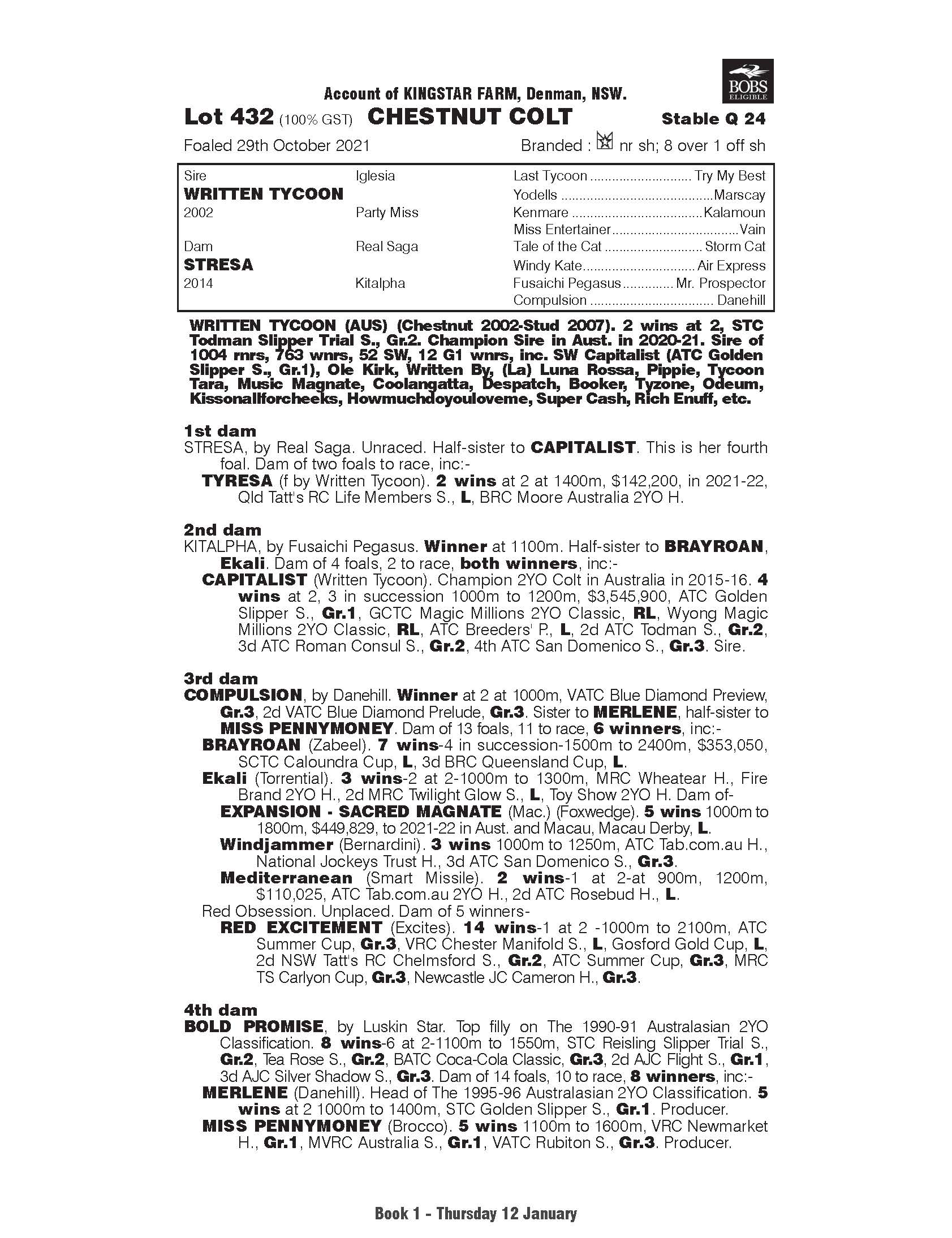 His Dam STRESA has also produced a 2YO Stakes Winning Full Sister named TYRESA and last week she produced a 2YO Winning filly named Queen Of The Mile (Written Tycoon), another Full-Sister to our Colt.