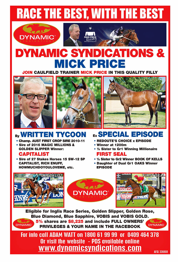 Dynamic Syndications purchased a magnificent yearling filly at the Melbourne Premier Sale this year by the boom sire Written Tycoon from a half-sister to Gr1 Winner FIRST SEAL whilst her Grand-dam is EPISODE – a dual Gr1 Oaks Winner. She is in the care of MICK PRICE at Caulfield. 5% Shares are $8,225.