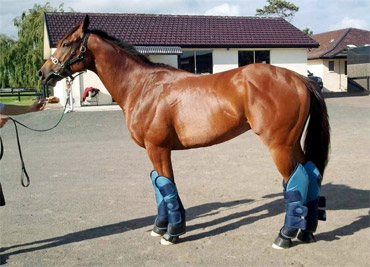 ATOMIC FORCE in his travel gear. Note that his hooves are bandages as well as the bell boots over the hoof walls and the leg boots to ensure he is protected on the truck and in the box on the plane. He has special rugs travelling with him to ensure his comfort whatever the weather. As can be seen he has a glow in his coat and is rock hard fit.