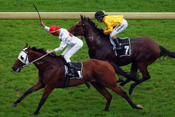 NASH RAWILLER salutes winning the Gr1 Railway Stakes aboard ATOMIC FORCE