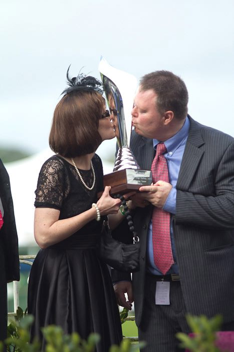 STEPHEN & SHARON McCREA love the Trophy won by their horse ATOMIC FORCE in the Gr1 RAILWAY STAKES