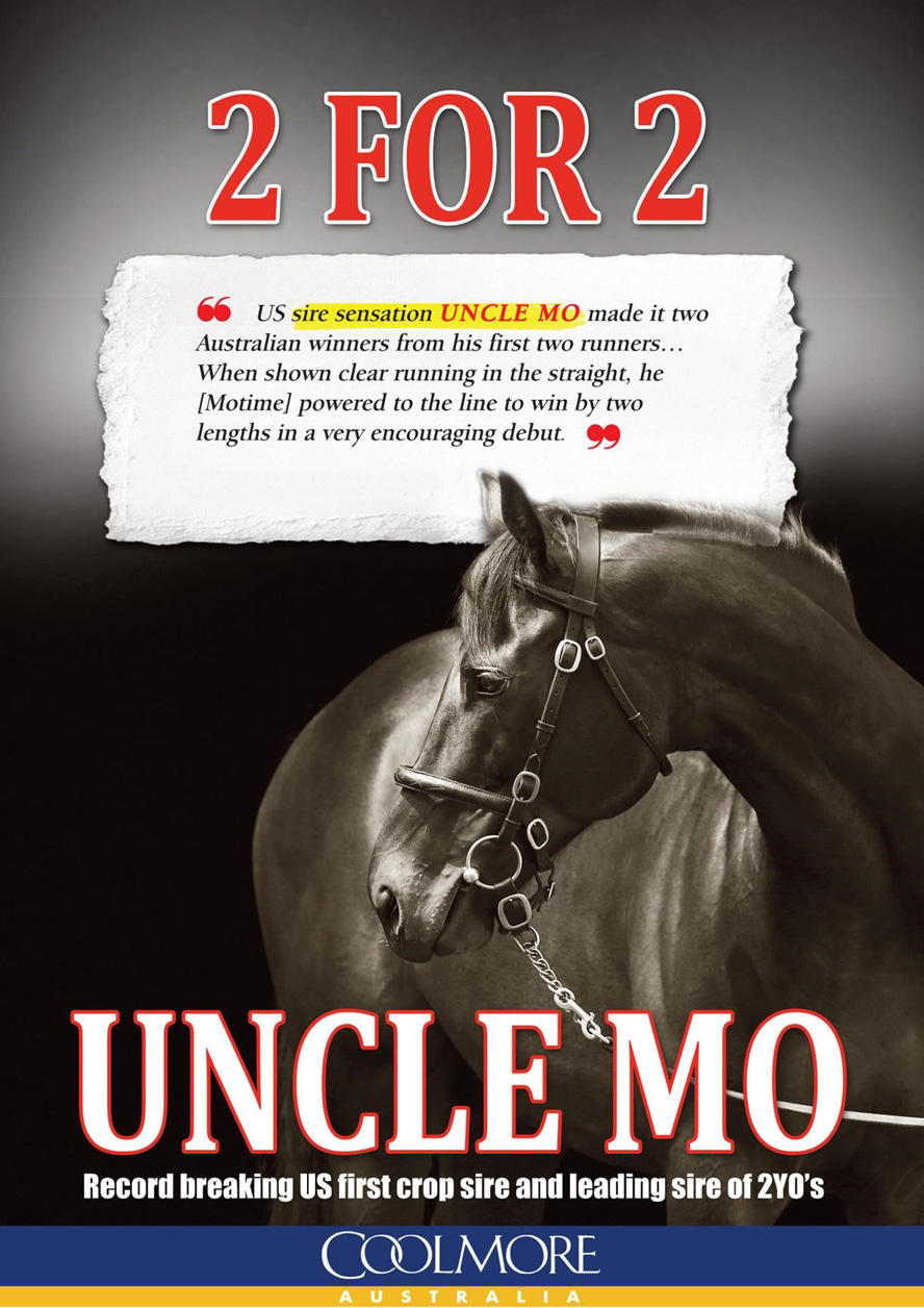 Coolmore based USA sire sensation UNCLE MO made it 2 Australian winners from his first 2 runners when Motime saluted on debut at Canberra on Friday. Uncle Mo has 25 Individual Winners in the USA which sees him lead the first crop sires premiership. Uncle Mo has also produced 7 Stakes Winners and 4 stakes placed.